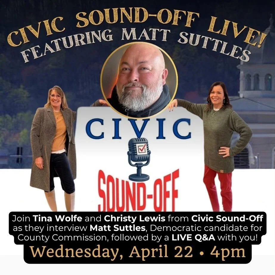 Back to All Events Civic Sound-Off LIVE! Featuring Matt Suttles Wednesday, April 22, 2026 4:00 PM 5:00 PM Google Calendar ICS Join co-hosts Tina Wolfe and Christy Lewis from Civic Sound-Off as they interview Matt Suttles, Democratic candidate for the McDowell County Board of Commissioners, followed by a LIVE Q&A with you!